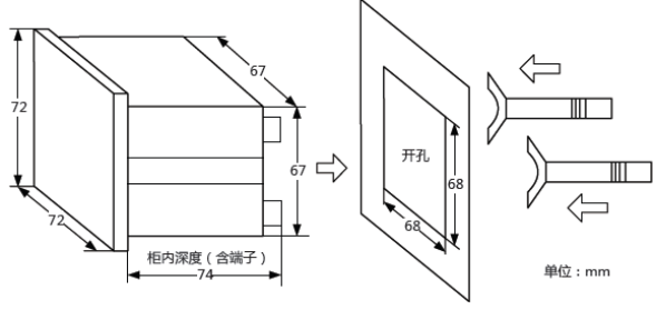 68*68mm,非常适用(yòng)于抽屜櫃安裝,外(wài)形尺寸72*72mm。