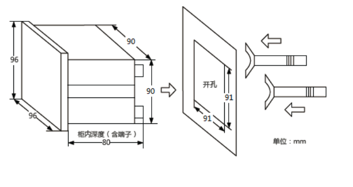 91*91mm,非常适用(yòng)于普通(tōng)開(kāi)孔安裝,外(wài)形尺寸96*96mm。